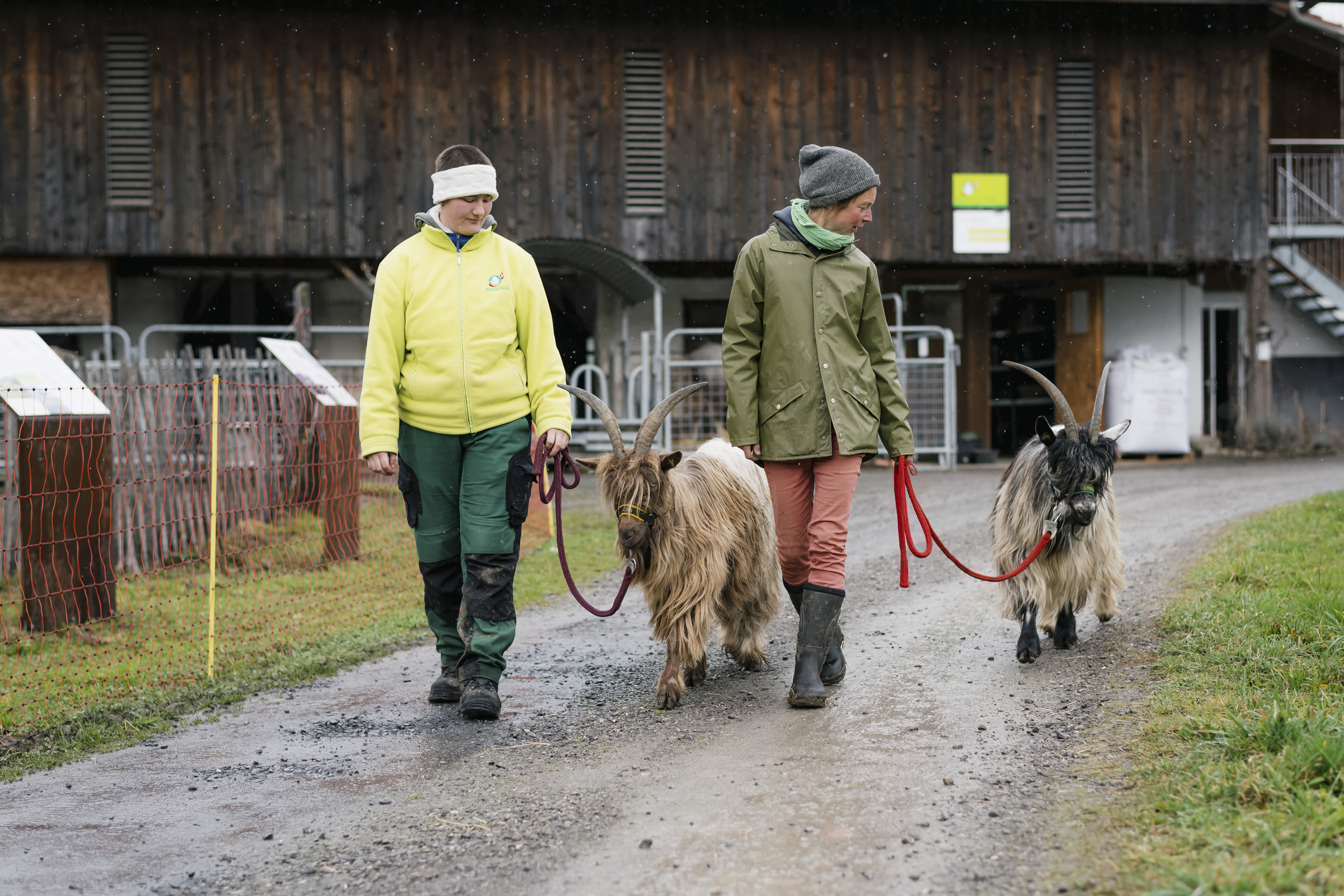 Die Anwendungsmöglichkeiten der tiergestützten Intervention sind sehr vielfältig. In der Startphase des Projektes kommen die Teilnehmer*Innen in kleinen Gruppen auf den Hof. Hier besprechen wir miteinander das vorgesehene Thema oder Programm. Dieses wird jeweils individuell auf die Möglichkeiten der Klient*innen angepasst. Wir beschäftigen uns zum Beispiel mit den Ziegen. Nachdem ich sie vorgesellt und ihre Eigenheiten erklärt habe, reinigen wir miteinander den Stall und bereiten das Futter vor. Die Ziegen sind währenddessen auf der Weide oder drinnen bei uns, so wie es den Teilnehmer*innen angenehmer ist. Danach beschäftigen wir die Ziegen. Dazu gibt es verschiedene Möglichkeiten; wir können sie striegeln, Kunststücke üben oder einen kleinen Spaziergang mit ihnen machen. Dazwischen gibt es eine Pause im Aufenthaltsraum des Bauernhofes oder bei schönem Wetter im Freien, wo wir dabei die Tiere beobachten können. Das Tempo und die Arbeiten werden ganz den Fähigkeiten der Teilnehmenden angepasst. Auch die Tiere werden so ausgewählt, dass sich alle in der Gruppe wohl fühlen. Bevor es zurück zum Wohn- oder Arbeitsort geht, besprechen wir miteinander, was toll war, was noch schwierig ist und was man beim nächsten Mal üben oder erfahren möchte.