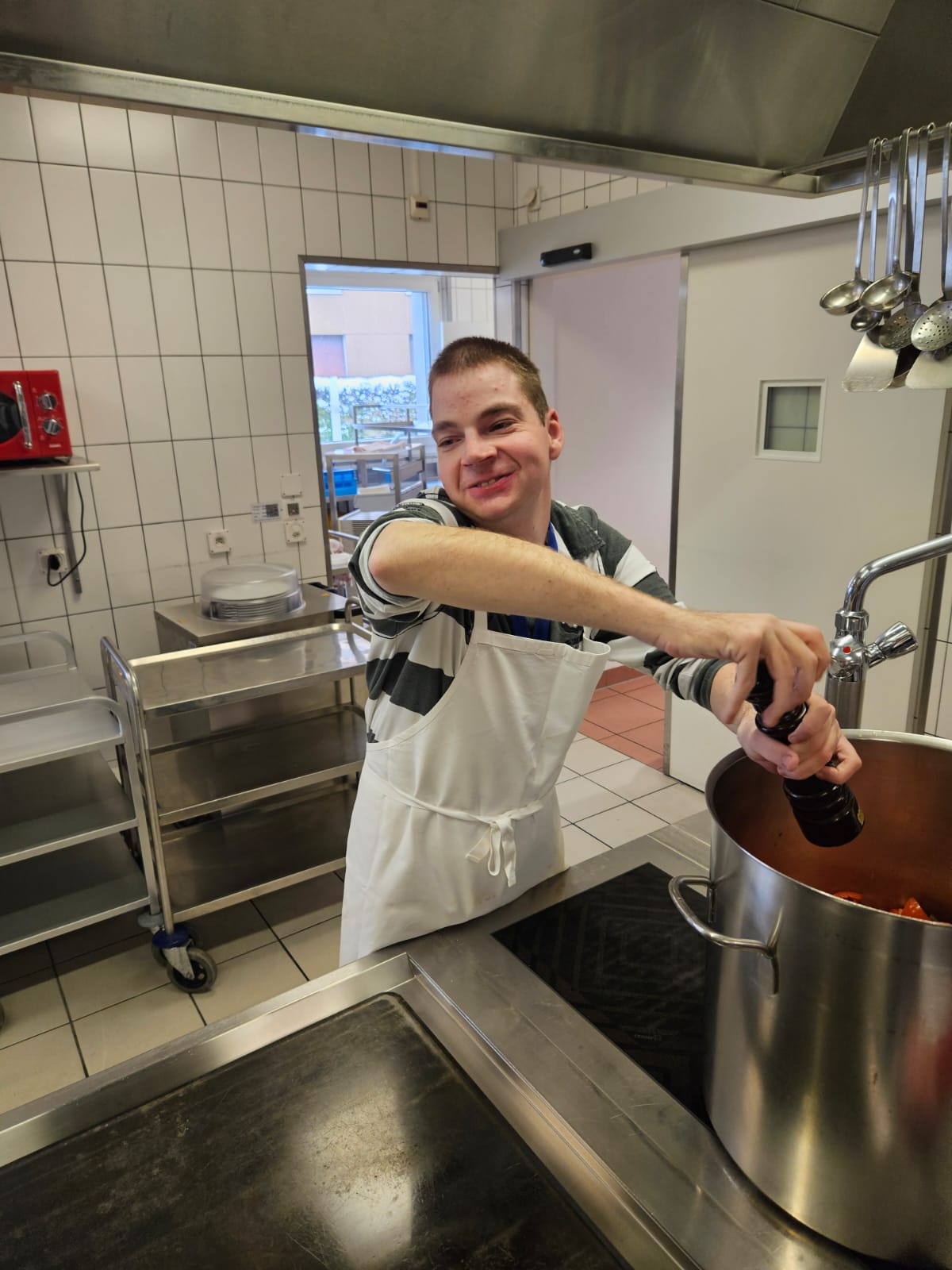 Das Mitarbeiten im variablen Küchenteam bereitet am Standort Einsiedeln grosse Freude. Denn es ermöglicht einen anderen Einblick, bietet neue Lernfelder und die Mitarbeitenden erleben einen Tapetenwechsel. Dank der einfachen Anmeldung können sich Mitarbeitende des ganzen Standortes einschreiben, unabhängig von der Beeinträchtigung. Als Arbeitsagoge kann Philip auf die verschiedenen Bedürfnisse eingehen und bereitet die Arbeitsplätze und Aufgaben entsprechend vor. So dürfen sich die Mitarbeitenden auch in Zukunft auf abwechslungsreiche Einsätze freuen.