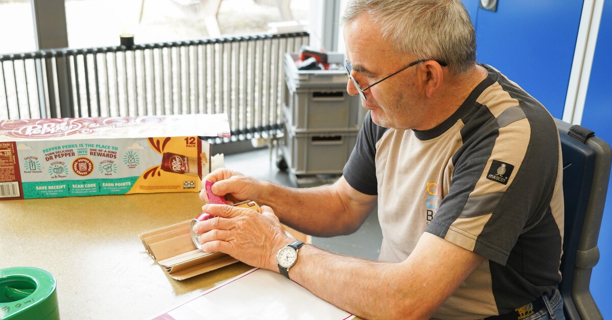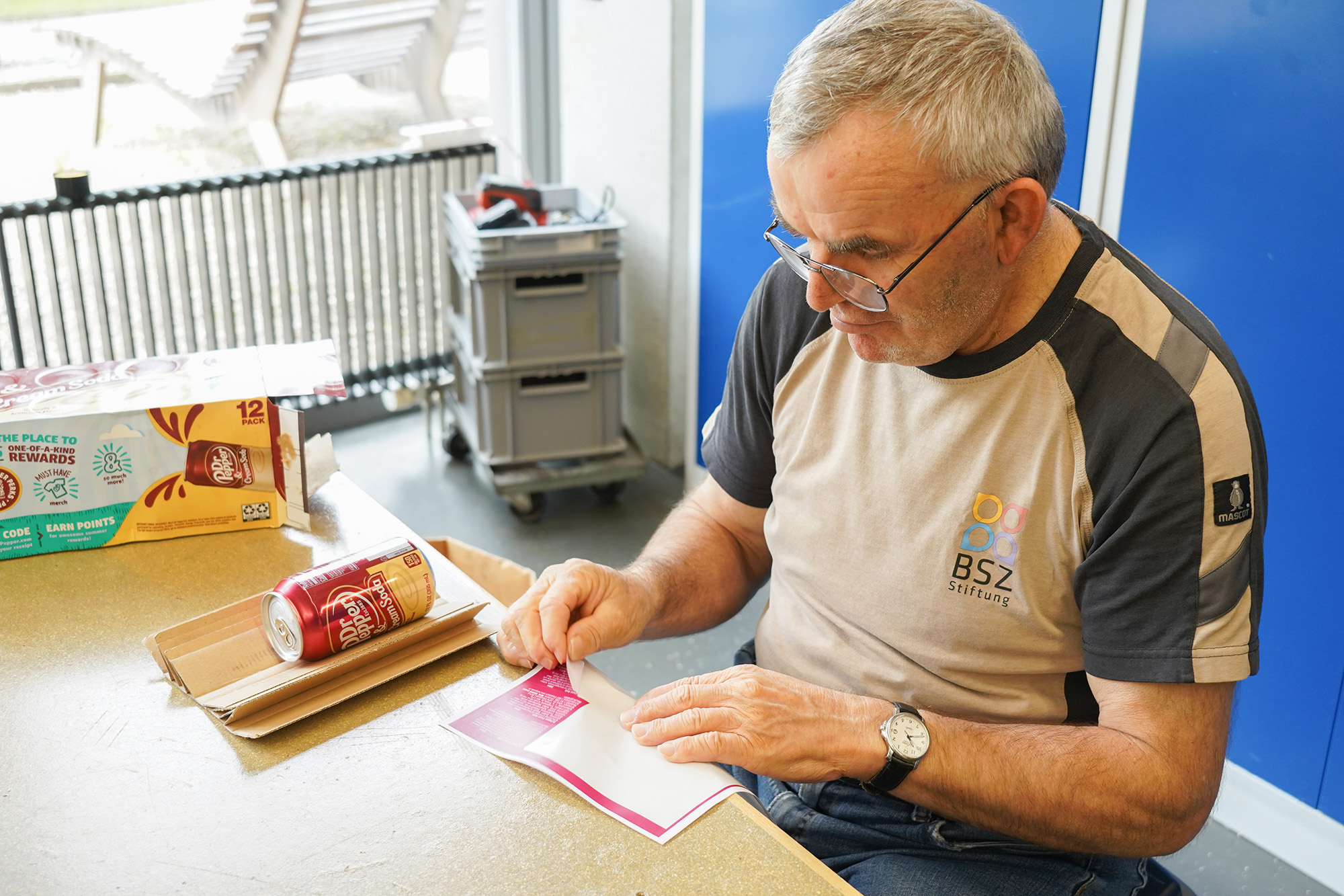 damit zum Beispiel die Dosen nicht wegrollen. «Wir helfen uns gegenseitig oder schauen einander über die Schulter, um die Arbeit effizienter zu machen», teilt uns Markus Lienert, Mitarbeiter Montage, mit. Auch die Gruppenleiterin ist dankbar für diesen Auftrag, da er für alle Mitarbeitenden eine sinnstiftende Teilhabe bietet. Sie erleben ihre Selbstständigkeit, bauen ihre Ausdauer aus, übernehmen Eigenverantwortung für ihr Tun. Und das gegenseitige Unterstützen trägt zur Teambildung bei.