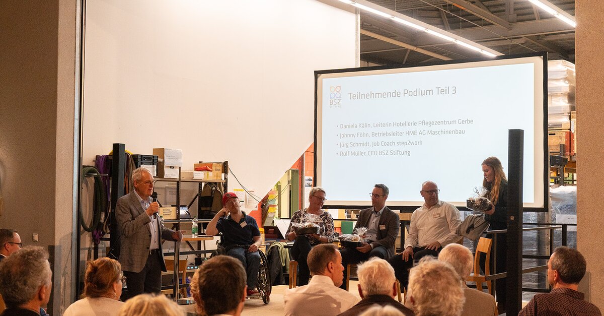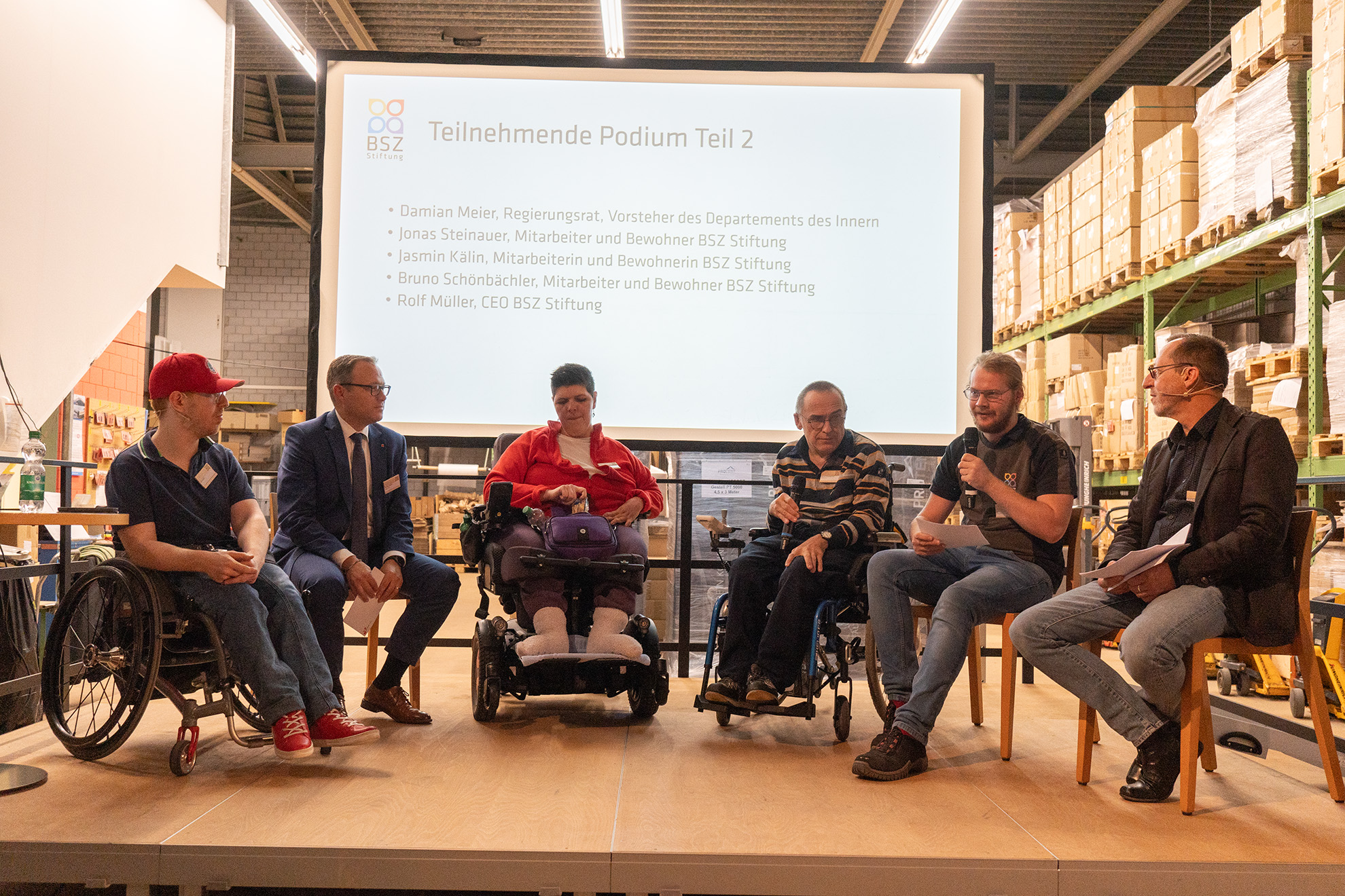 Ein Höhepunkt des Podiums war die Zukunftssicht zwischen Regierungsrat Damian Meier und drei Mitarbeiter*innen der BSZ Stiftung. Gemeinsam diskutierten sie wünschenswerte Entwicklungen im Kanton Schwyz. Zentrales Thema war dabei der Einbezug und Dialog mit den Selbstbetroffenen: «Mir persönlich ist es ein grosses Anliegen, dass wir miteinander und im Austausch an die weitere Arbeit gehen und so Entwicklungen im Behindertenbereich vorantreiben», betonte Damian Meier.