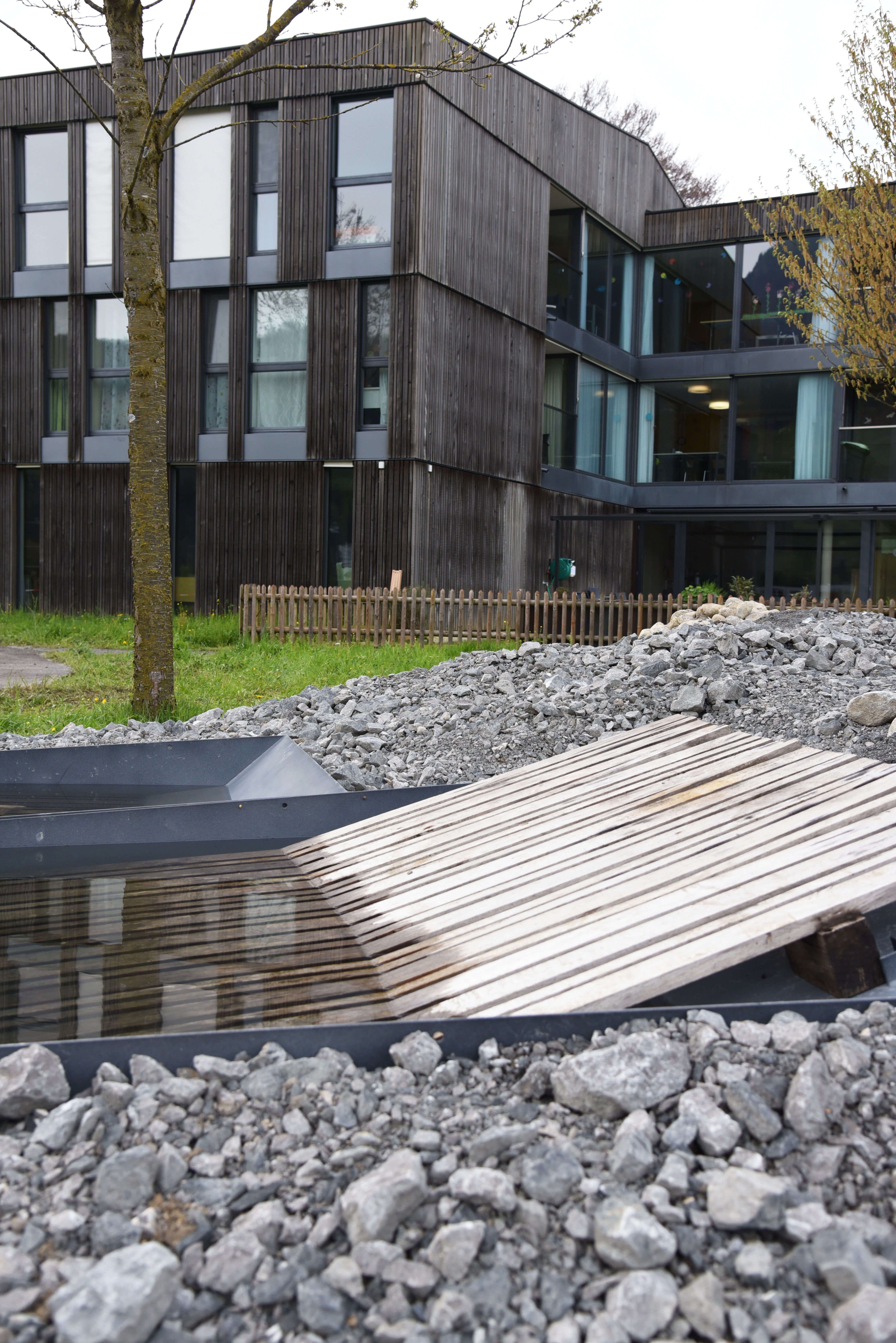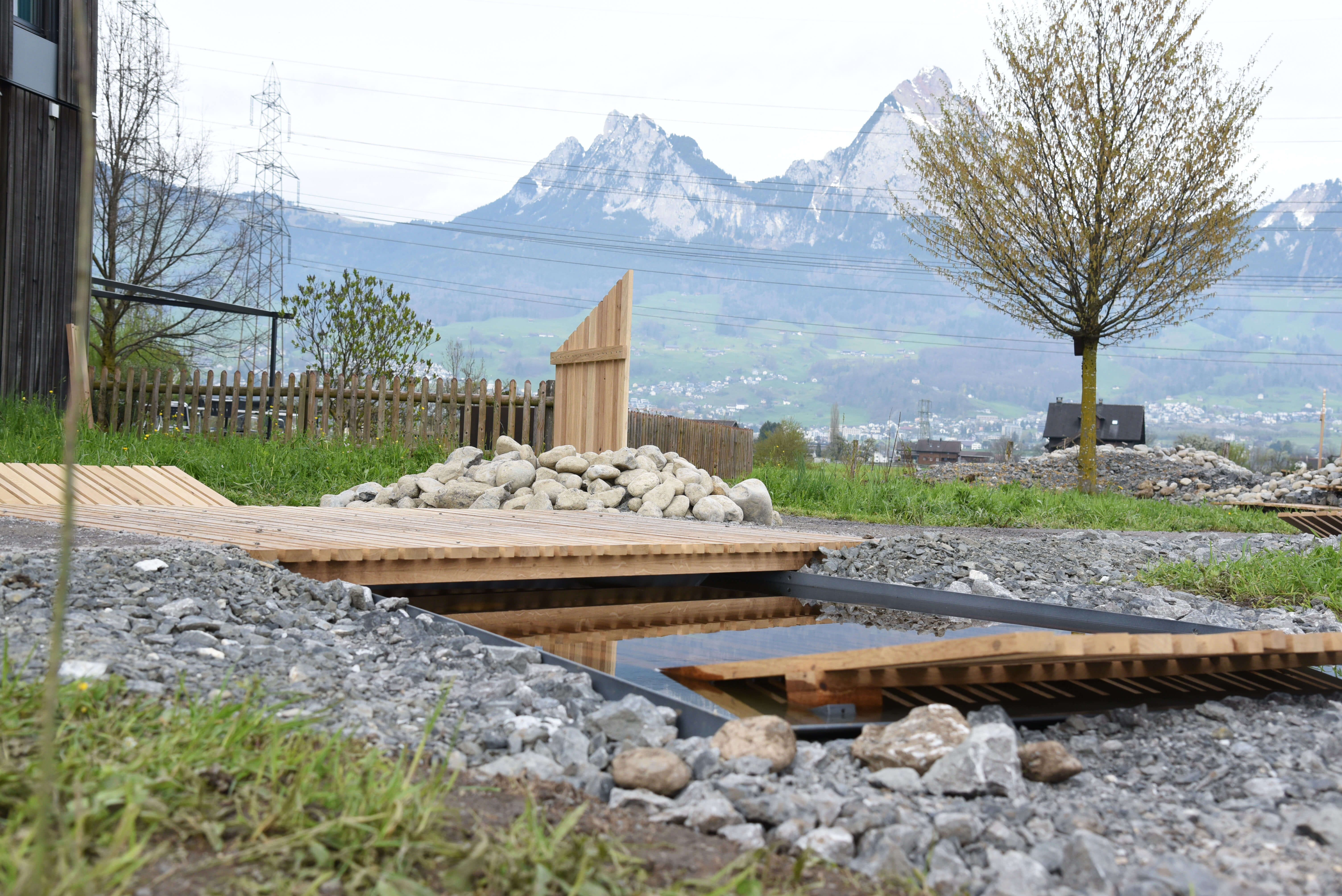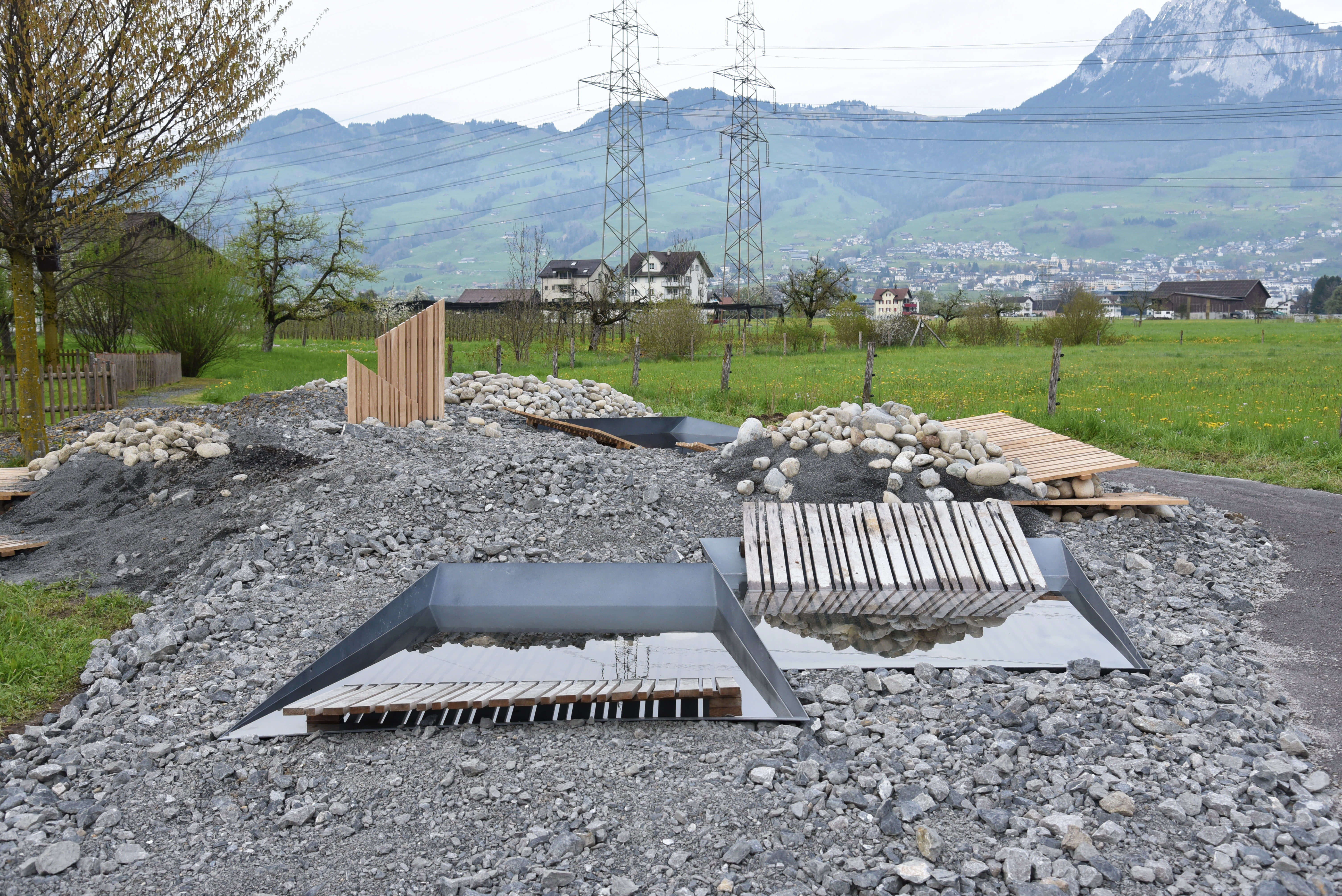 Die BSZ Stiftung, die Koordinationsstelle für Amphibienschutz Schwyz (KARCH) und das Amt für Wald und Natur nutzen diese guten Voraussetzungen, um die Gelbbauchunken mithilfe von neun Metallbecken zu fördern. Das Besondere am interdisziplinären Natur-, Sozial- und Kunstprojekt «UnkenART»: die künstlichen Unkenlaichgewässer werden künstlerisch in die Umgebung eingebunden. Das Aussehen der Becken lehnt sich dabei optisch an die Fassade des BSZ Wohnheims Ingenbohl an. «Diese Verbindung von Kunst und Natur war Herausforderung und Reiz in allen Umsetzungsschritten,» sagt Initiant und Fachbegleiter Thomas Hertach. Finanziert wird das Projekt durch Beiträge einer Förderstiftung und des Kantons. Hergestellt wurden die Holzelemente von Menschen mit Unterstützungsbedarf in der Holzbearbeitung der BSZ Steinen.