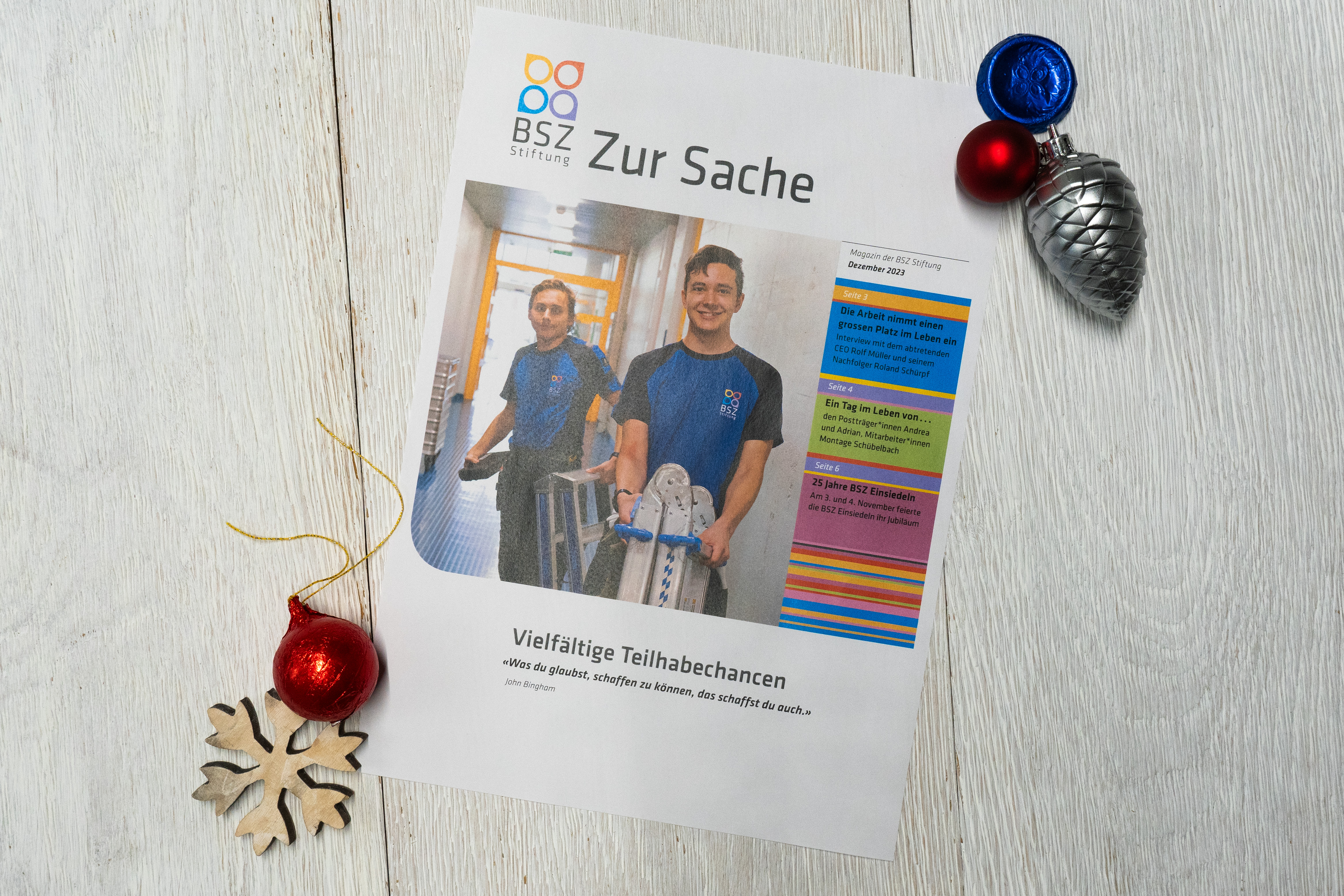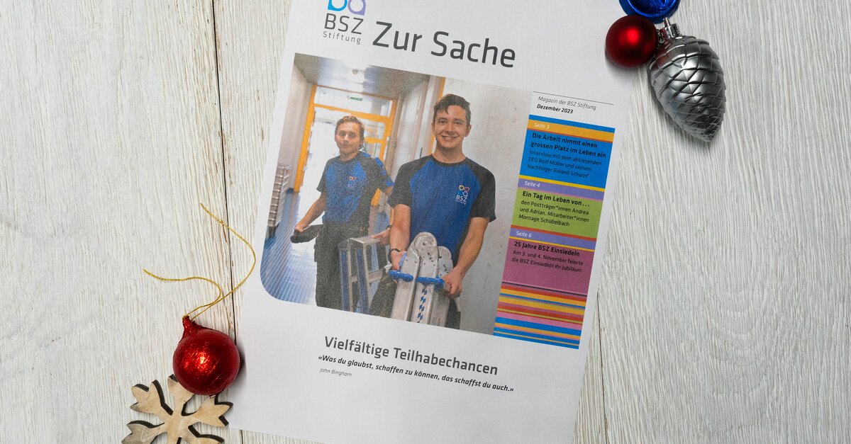 In der letzten Ausgabe des «zur Sache» 2023 schauen Stiftungsratpräsidet Paul Lalli und CEO Rolf Müller auf ihre Zeit in der BSZ Stiftung zurück. Wir begleiteten die Posträger*innen Andrea und Adrian auf ihrer Tour und besuchten Käthi nach ihrem Tandenflug. Zudem feierte die BSZ Einsiedeln im November das 25 Jahre Jubiläum. Vielfälltige Teilhabechancen werden vorgestellt. Wir wünschen viel Spass beim Lesen.